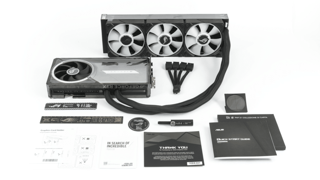 - Kết cấu kim loại nguyên khối: Lớp vỏ nhôm phay xước mang họa tiết dải ngân hà không chỉ tăng tính thẩm mỹ mà còn gia cố độ cứng cáp. ASUS cũng vô cùng chu đáo khi đi kèm một giá đỡ trợ lực (VGA Holder) chất lượng cao để bảo vệ khe cắm trên bo mạch chủ.