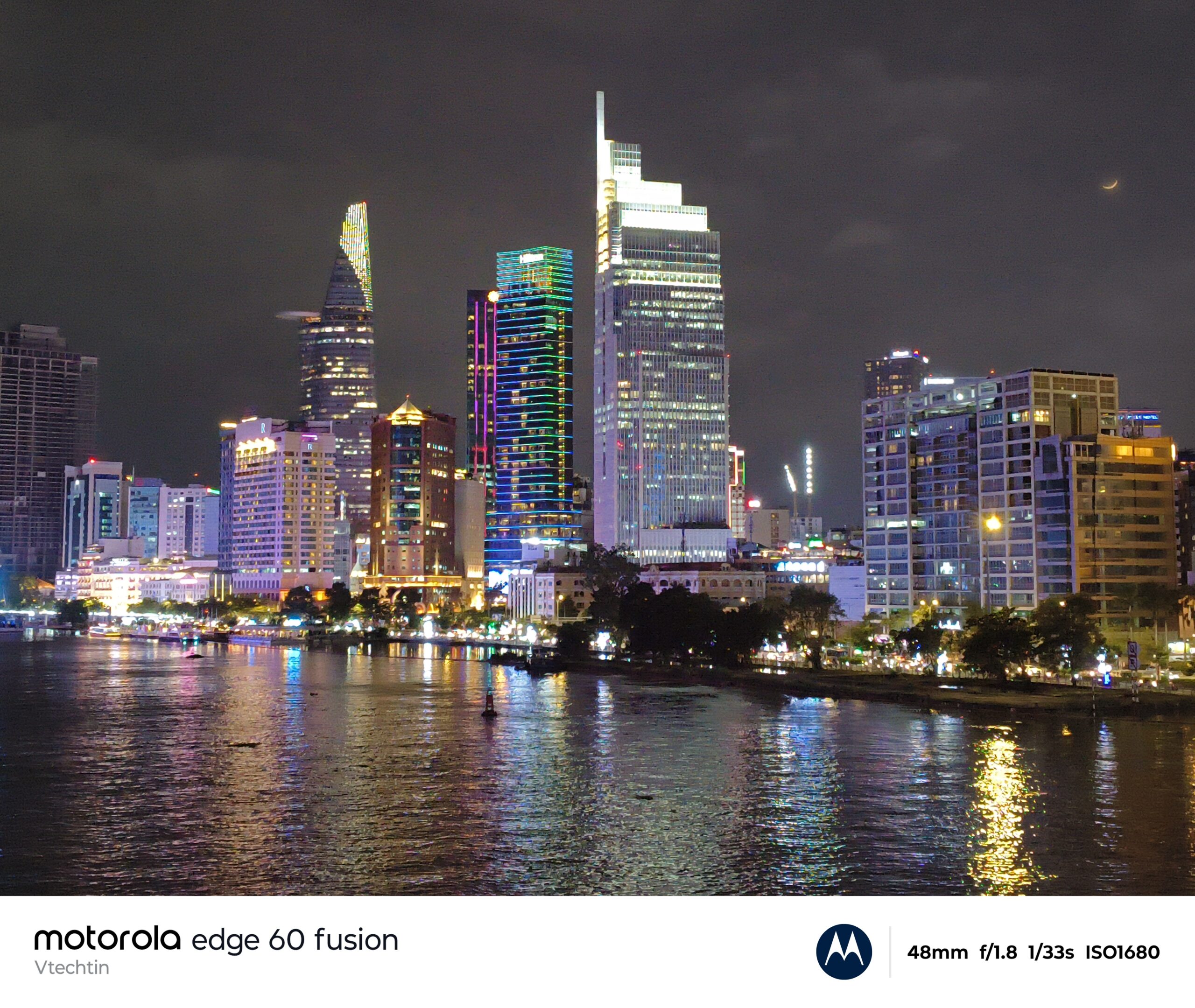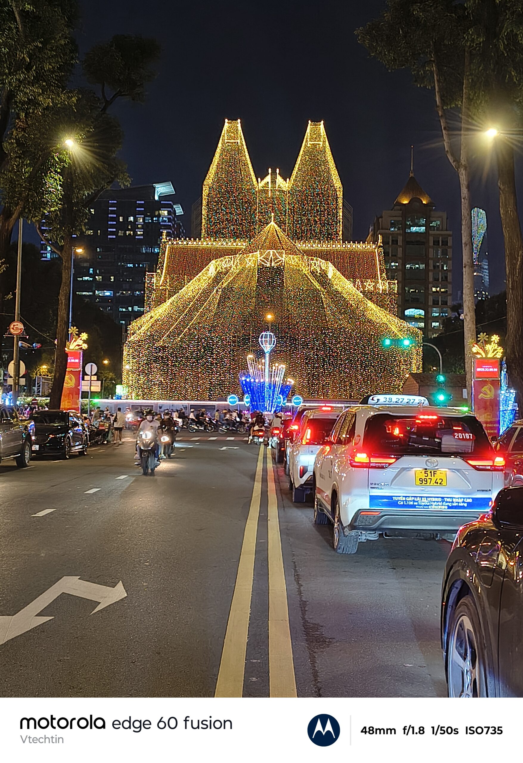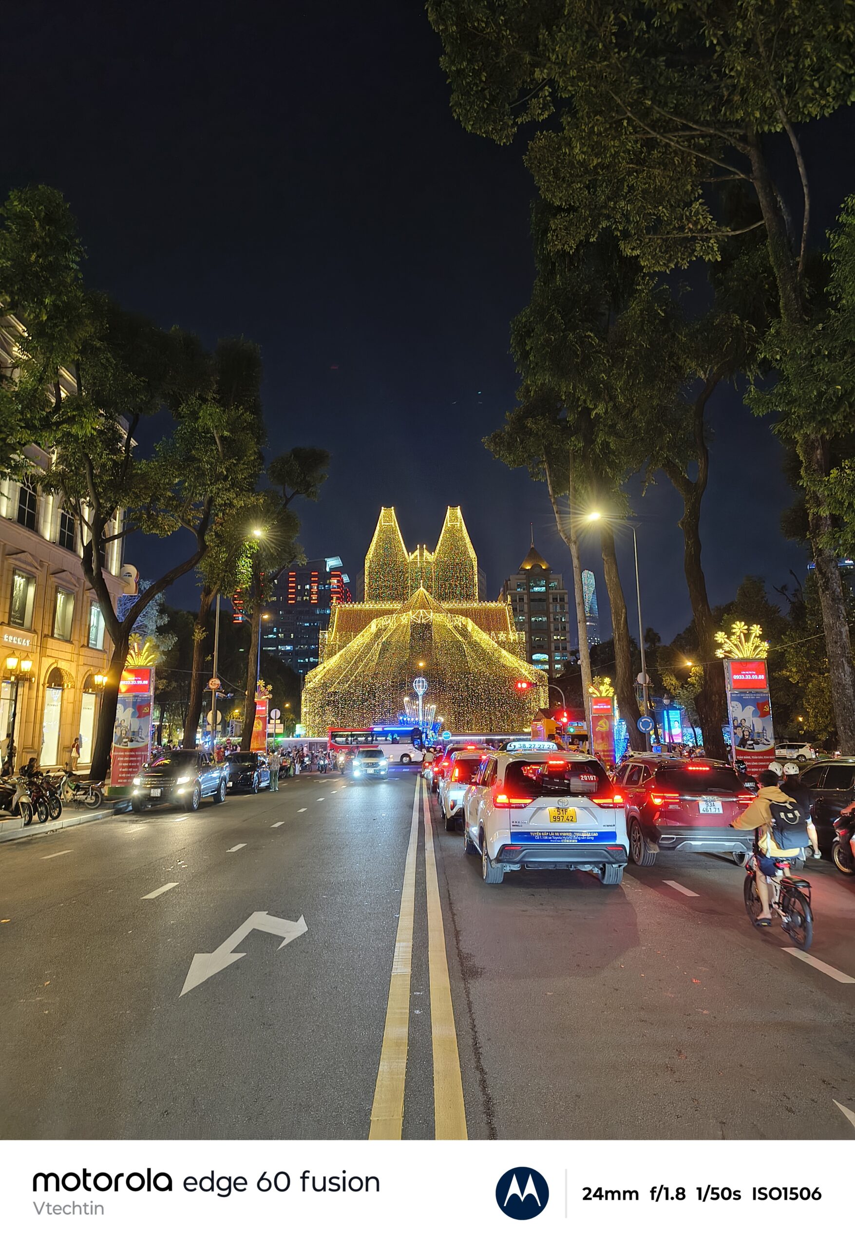 Ảnh chụp thiếu sáng trên Motorola Edge 60 Fusion khá ít noise, nhưng cũng không bị bệt. Độ tương phản cao. Vùng sáng được kéo lại khá cân bằng, vùng tối không bị đẩy sáng quá nhiều. Từ đó, hạn chế hiện tượng bầu trời tối bị xám xịt thay vì màu đen vốn có. Tuy nhiên, có 1 điều kiện mình thấy máy chưa xử lý tốt là khi chụp tối nhưng quá nhiều chi tiết sáng li ti. Cụ thể là mình có chụp ảnh nhà thờ Đức Bà đang được giăng các dây đèn, thì ảnh có hiện tượng color noise. Hiện tượng này chỉ xảy ra khi mình chụp ảnh zoom 2x, còn nếu vẫn để 1x thì ảnh vẫn rất ổn.