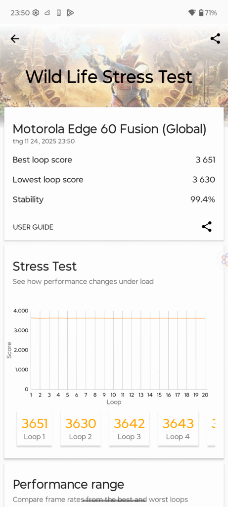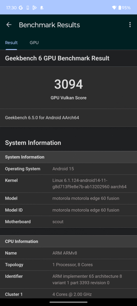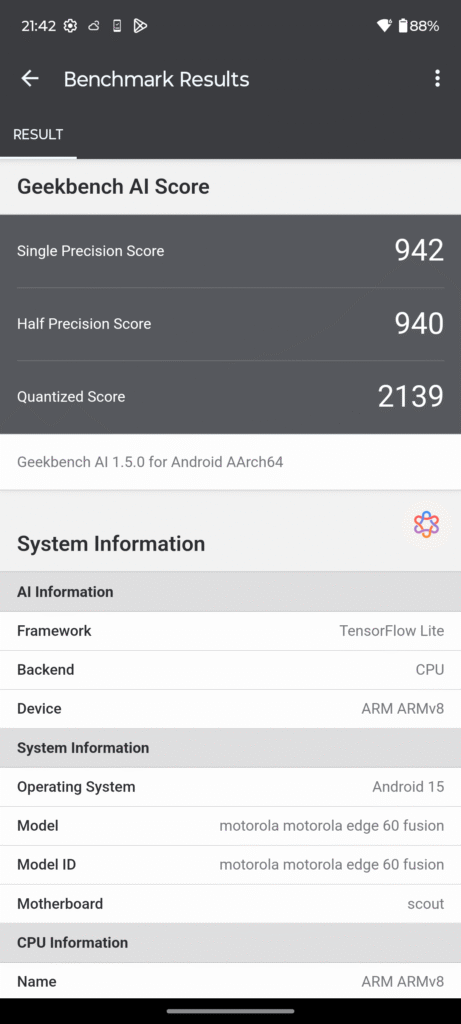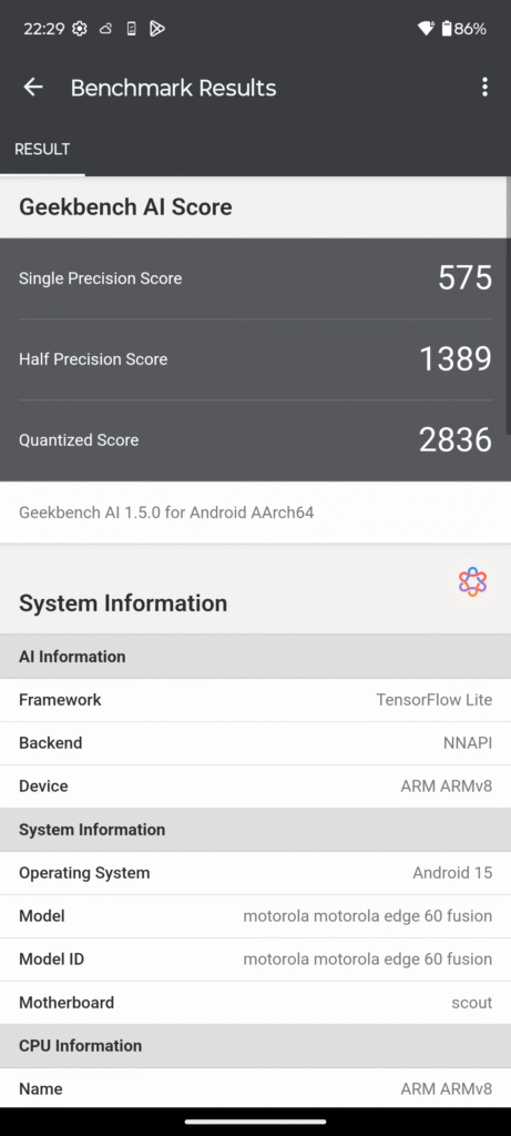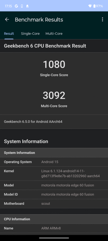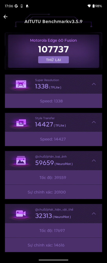 Motorola Edge 60 Fusion chạy SoC MediaTek Dimensity 7400. Đi kèm với đó là bộ nhớ ram 8GB và có thể mở rộng lên đến 16GB. Bộ nhớ trong 256GB thoải mái lưu trữ. Máy còn được chạy trên nền giao diện Android thuần. Gần như rất ít những app rác hoặc app hệ thống. Với những yếu tố này, dù không phải là 1 cấu hình quá mạnh nhưng vẫn tạm đủ cho các nhu cầu hằng ngày. Thậm chí là bạn hoàn toàn có thể chơi game mượt mà trên chiếc máy này.