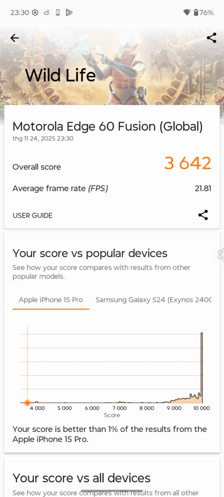 Trên đây là những đánh giá của mình về Motorola Edge 60 Fusion sau khi được trải nghiệm 1 thời gian. Với mình thì đây là 1 màn quay trở lại khá ổn của Motorola. Nếu bạn cần 1 chiếc máy có thiết kế ấn tượng, cảm giác cầm nắm thoải mái, giao diện tinh gọn, đặc biệt là màn đẹp thì đây là sự lựa chọn khá tốt.