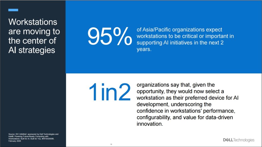 Nghiên cứu của IDC về máy trạm đã phản ánh chân thực bức tranh thực tế này. Có tới 95% doanh nghiệp trên toàn khu vực Châu Á – Thái Bình Dương kỳ vọng máy trạm sẽ đóng vai trò thiết yếu hoặc quan trọng trong các chiến lược AI trong hai năm tiếp theo; trong khi 50% khẳng định sẽ chọn máy trạm làm thiết bị ưu tiên hàng đầu cho quá trình phát triển AI. Đáng chú ý, 97% doanh nghiệp đều đồng tình rằng máy trạm là những hệ thống hiệu năng cao giúp tạo đà cho sự đổi mới sáng tạo của doanh nghiệp, thông qua việc trao quyền cho các đội ngũ khám phá những công nghệ mũi nhọn như AI và các mô hình Học máy (Machine Learning).
