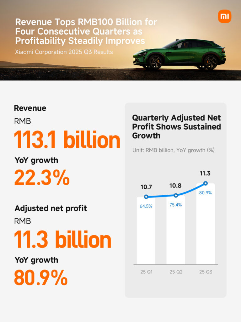 Tập đoàn Xiaomi đã công bố báo cáo tài chính hợp nhất chưa kiểm toán cho quý III/2025, kết thúc ngày 30/9/2025. Kết quả kinh doanh quý III tiếp tục phản ánh đà tăng trưởng ấn tượng của doanh nghiệp.