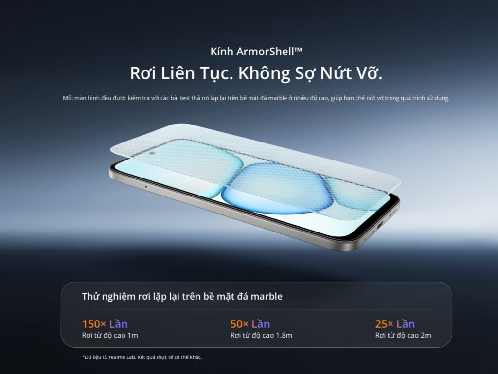 Bên trong, realme C100 được trang bị lớp bảo vệ ArmorShell™ 360 độ, bao gồm các cấu trúc gia cố tại góc máy, đệm khí giảm chấn, khung giữa tăng cường và hệ thống ổn định chống va đập. Thiết kế này giúp phân tán lực tác động khi rơi, từ đó bảo vệ các linh kiện quan trọng và duy trì độ bền tổng thể của thiết bị theo thời gian.