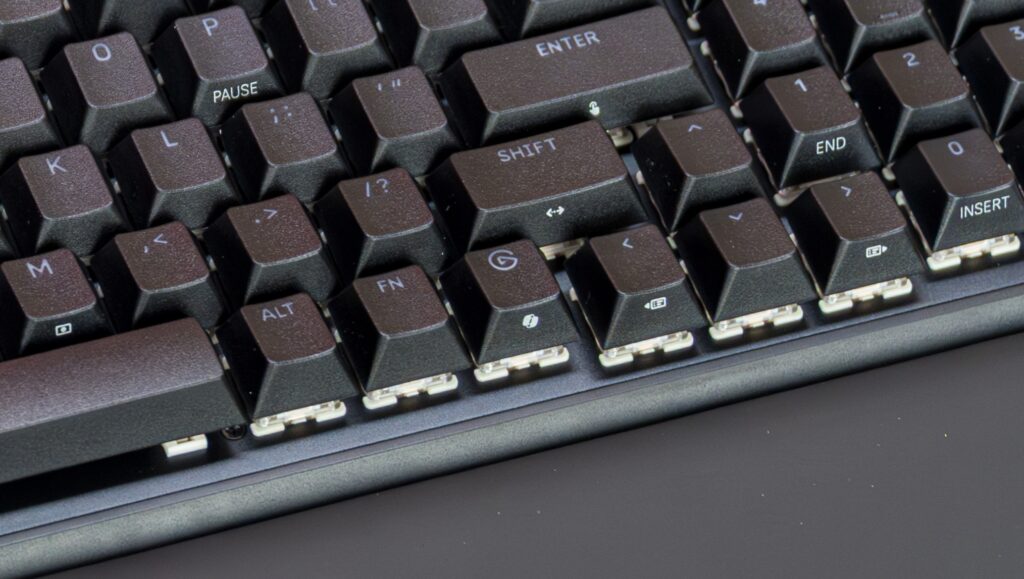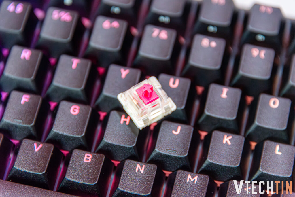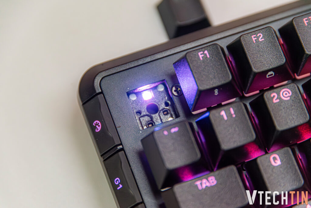Phần thân phím cũng được trang bị đầy đủ các loại foam. Bề mặt keycaps được hoàn thiện từ nhựa PBT Doubleshot có khẩ năng xuyên LED. Tổng thể tất cả cho ra âm khá gọn, thiên hướng clacky, không quá lớn và êm dịu. Thế nên, nếu các bạn có dùng để chiến game vào ban đêm với Corsair Vanguard 96 cũng không sợ bị “gank” bất ngờ.