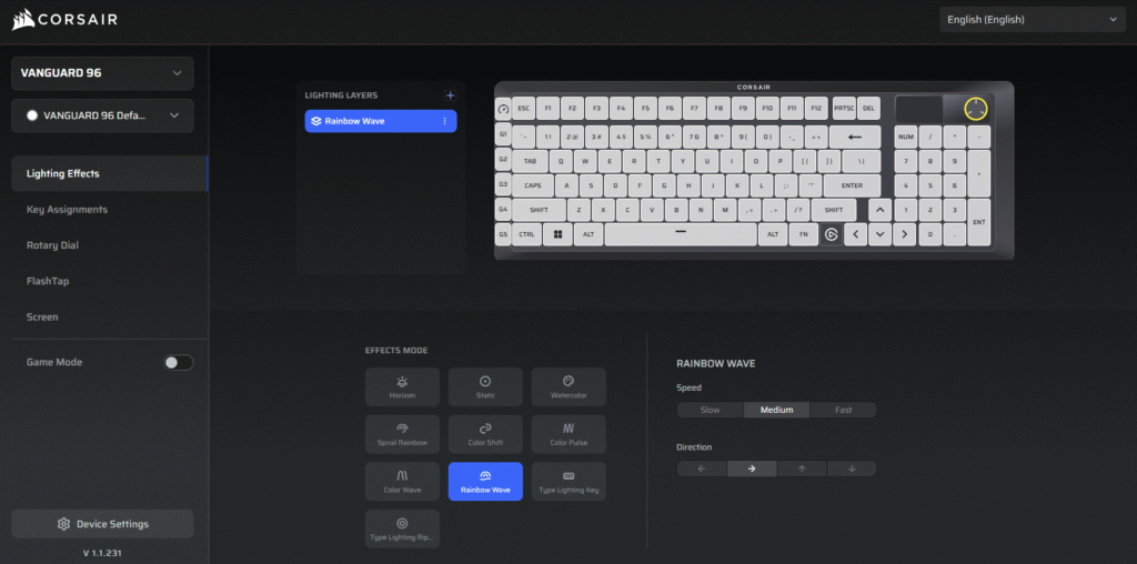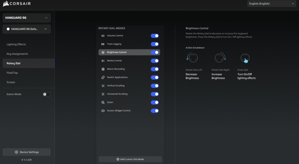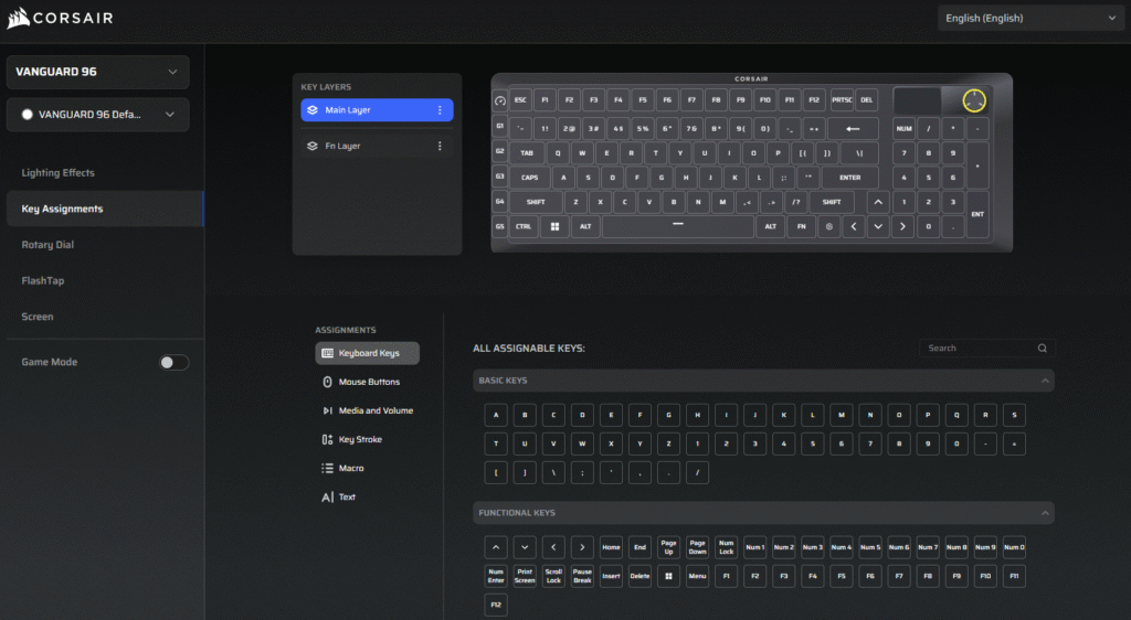 Corsair Vanguard 96 cũng khá tương đồng với mẫu chuột SCIMITAR ELITE WIRELESS SE trước đây ở 1 tính năng. Đó là khả năng StreamDeck ảo. Với 1 phím bấm trên bàn phím, bạn đã có thể tinh chỉnh mọi tính năng như StreamDeck. Hơn thế nữa, núm xoay ở gần màn hình cũng có thể đóng vai trò như 1 chiếc StreamDeck Plus. Và với tính năng kết hợp StreamDeck như vậy, nó sẽ tăng độ tiện lợi cho bạn nếu bạn là 1 media hoặc 1 streamer.