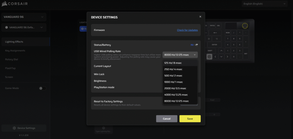 Corsair Vanguard 96 ở phân khúc giá cũng khá cao, nhưng tiếc là mẫu phím này chỉ có 1 chế độ kết nối. Bạn hoàn toàn có thể sử dụng sản phẩm với kết nối có dây thông qua cổng USB Type C. Phím có Polling Rate lên đến 8000Hz. Từ đó, mang lại độ trễ thấp, khả năng bấm phím chính xác, tăng khả năng giành chiến thắng trong game. Và do chỉ có kết nối có dây, hãng đã tinh tế thiết kế các rãnh đi dây dưới đáy. Từ đó, bạn có thể sắp xếp đi dây cho phù hợp với không gian bàn làm việc của bạn.