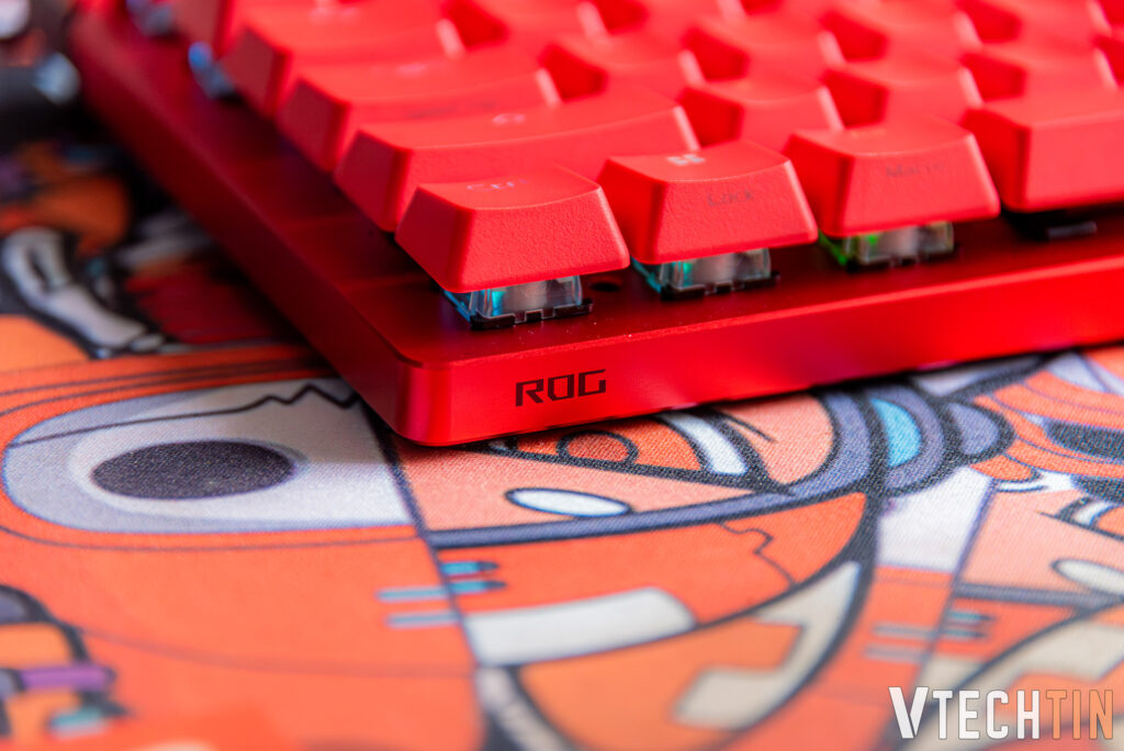Điểm nhấn và nổi bật không thể không kể đến dải LED chạy dọc cạnh trên ở bề mặt phím. Bên cạnh đó là logo ROG có LED RGB hoạt động tương tự với dải LED. Tất cả tạo nên vẻ độc bản, và khả năng nhận diện thương hiệu mạnh mẽ.