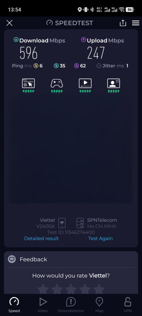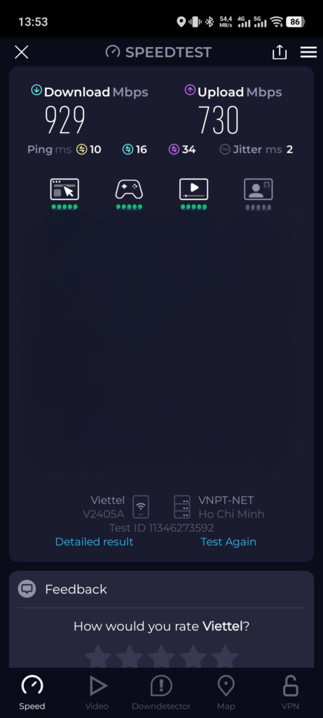 Và vì được trang bị nền tảng wifi 7 nên tốc độ truy cập sẽ cao hơn. Model được mang ra kiểm nghiệm là 1 router wifi 6, có cổng LAN 1Gbps. Tốc độ truy cập được chỉ đạt khoảng 60-80% so với TP-Link Archer BE220. Độ ổn định cũng không thật sự tốt khi trong 10 lần test, chỉ có 2 lần đạt 80%, còn lại chỉ đạt 60% so với BE220