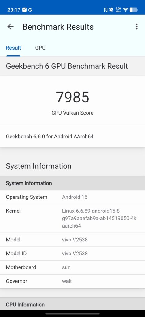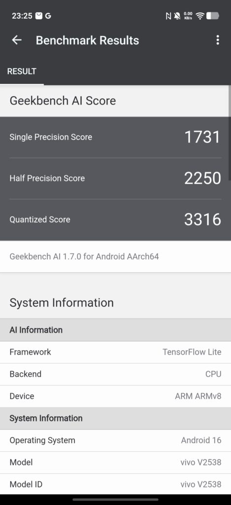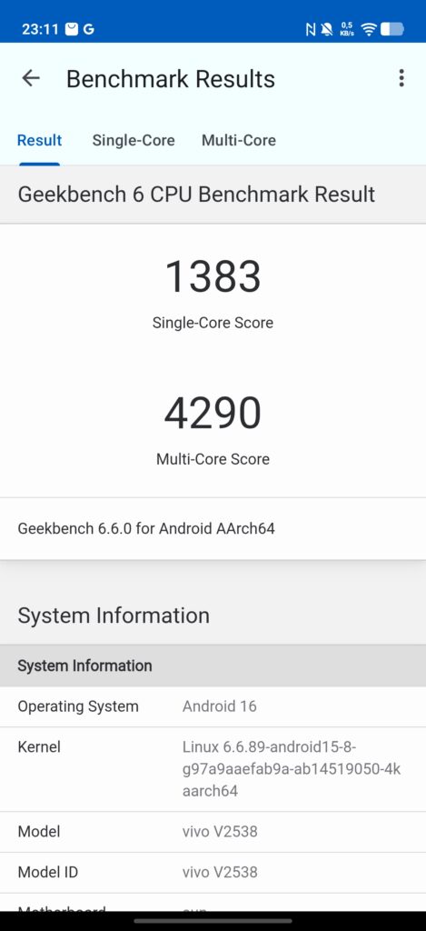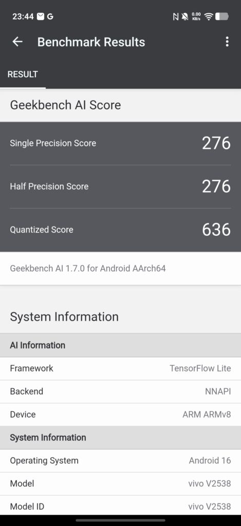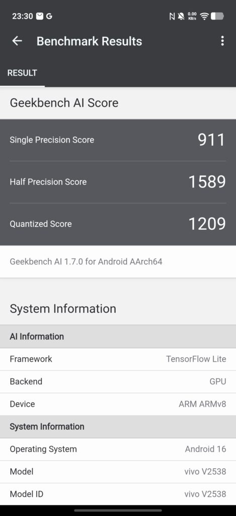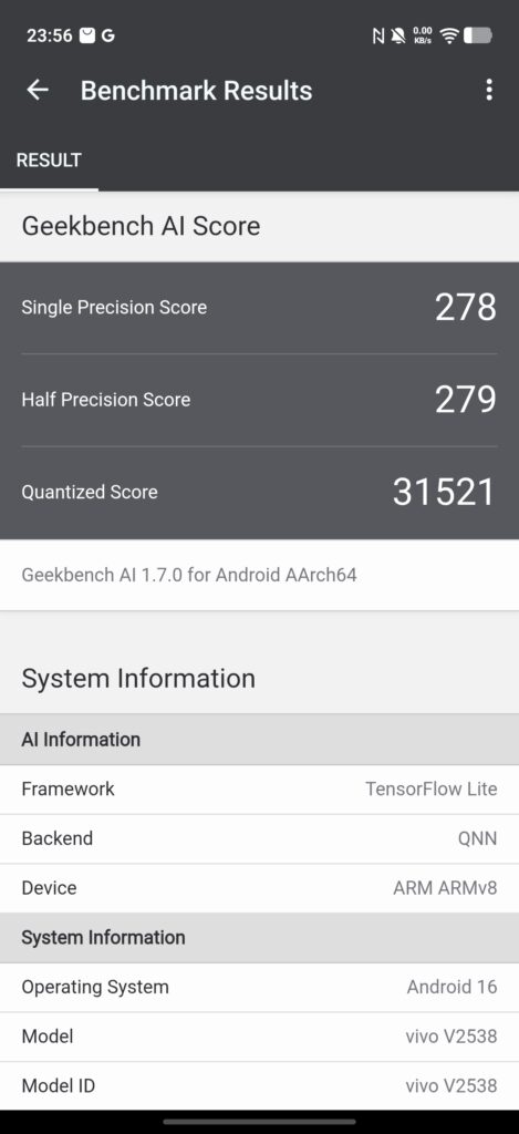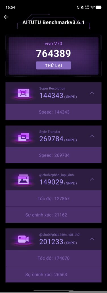 Qualcomm chính là hãng cung cấp SoC cho dòng smartphone vivo V70. Cụ thể, máy dùng chipset Qualcomm Snapdragon 7 Gen 4 – tương tự so với vivo V60 5G tiền nhiệm. Bộ nhớ ram 12GB và có 12GB RAM mở rộng. Bộ nhớ lưu trữ 256GB – tạm đủ để có thể tải đủ ứng dụng và chụp ảnh thoải mái. Hiệu năng thực tế thì mình có chấm benchmark nhanh qua các phần mềm dưới đây để bạn tham khảo nhé. Thực tế thì phản hồi của máy khi tắt mở ứng dụng hoặc dùng các ứng dụng hằng khá mượt mà, kể cả có edit video tiktok giật giật.